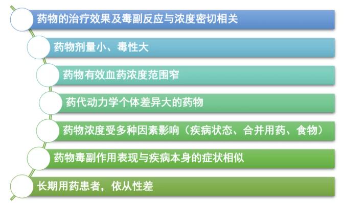 治療藥物監測(Therapeutic drug monitoring,TDM)是對治療指數窄、毒性作用強、個體差異大的藥物,通過測定其血液或其他體液中的藥物濃度,制訂個性化給藥方案,確保治療藥物濃度控制在治療范圍內,提高藥物療效、避免或減少藥物毒副反應,達到好的治療效果目的;同時TDM也可以為藥物過量中毒的診斷和處理,提供有價值的實驗室依據,將臨床用藥從傳統的經驗模式提高到科學的水平。