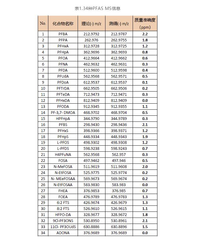 建立了關注較多的34種PFAS的MS及MS/MS譜圖信息高分辨質譜庫,所有物質MS誤差均在3 ppm以內(nèi)。