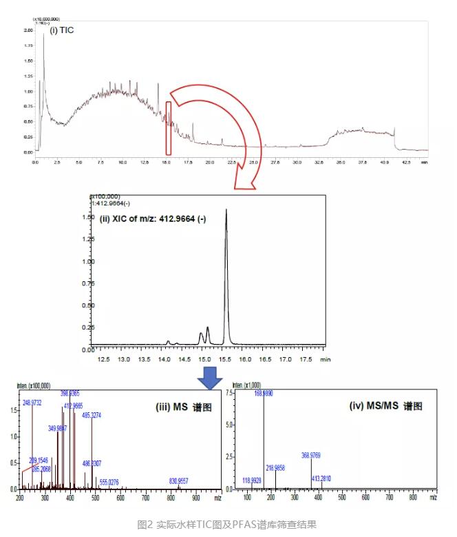 將地表水樣品濃縮50倍后直接進樣分析,利用質譜庫匹配保留時間、MS、MS/MS圖譜,在其中篩查到了PFOA,MS和MS/MS質譜的相似度分別為96%和92%,質量誤差0.18ppm(圖2)。