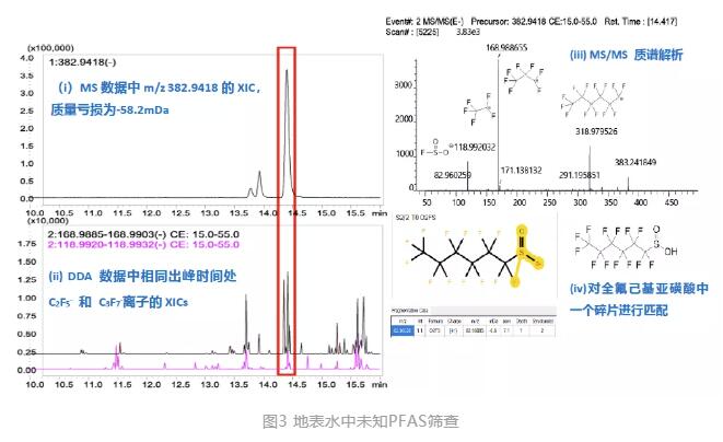 利用質量虧損過濾和特征碎片離子進一步篩查,發(fā)現(xiàn)(-)m/z 382.94179可能是一個未知PFAS:(i)匹配的質量虧損(-58.2 mDa),(ii)發(fā)現(xiàn)了C2F5-和C3F7-。采用分子式預測軟件,得到了高度匹配的分子式C6F13SO2H,質量誤差為+0.26 ppm,與MS/MS質譜中的碎片與C6F13-和FSO2-相匹配,推測該PFAS可能是全氟己基亞磺酸或其類似物(圖3)。