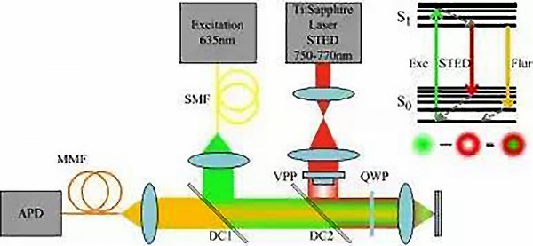 STED,全名是Stimulated Emission Depletion,受激輻射光淬滅。如下圖所示STED系統(tǒng)結(jié)構(gòu)示意圖,在右上角,有—副能級(jí)圖。其中,你看到紅色的箭頭和黃色的箭頭了嗎?
