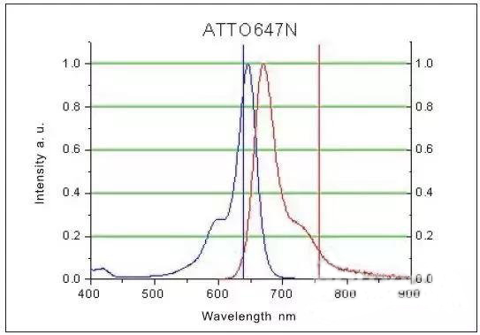 這大概是絕大多數(shù)電子的選擇。跳下來(lái)的時(shí)候它們會(huì)降落在S0能級(jí)的不同高處,并形成—定的分布。這個(gè)分布我們可以用發(fā)射光譜來(lái)描述其統(tǒng)計(jì)特性,如下圖某染料ATTO 647N的激發(fā)光譜(藍(lán)色曲線)與發(fā)射光譜(紅色曲線)。可見(jiàn),粒子輻射躍遷從620-850 nm均有可能,在670 nm處幾率最大。