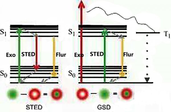 STED能級(jí)圖(左)和另一種超分辨的能級(jí)實(shí)現(xiàn)模式