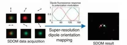 我們前面講述了STED是在空間維度將不同的點(diǎn)區(qū)分開(kāi),PLAM/STORM是在時(shí)間維度將不同的點(diǎn)分開(kāi)。這也就啟發(fā)科學(xué)家們?nèi)ニ伎寄芊裨谄渌S度將距離很近的兩個(gè)點(diǎn)分開(kāi)?2016年10月,北京大學(xué)席鵬課題組提出SDOM(Super-resolution Dipole Orientation Mapping microscopy)技術(shù),將兩個(gè)距離很近的點(diǎn)在偏振維度分開(kāi)從而實(shí)現(xiàn)了超分辨,該工作也得到了Nature Methods的亮點(diǎn)報(bào)道。