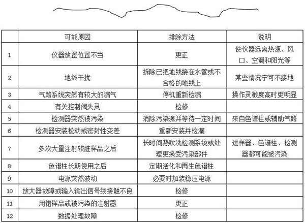 基線是氣相色譜儀運行中,性能的綜合表現,組成儀器的各部分發生故障、操作條件和外界條件的變化等因素都會反映到基線上,因此可以根據基線(色譜圖)判斷故障的原因和部位。