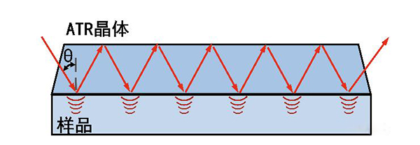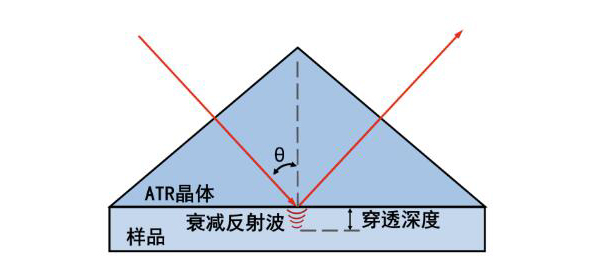 衰減全反射ATR就是利用該技術來獲得樣品的紅外光譜的。如上圖所示,光在ATR表面發生全反射,根據樣品的折射率衰減反射波達到一定穿透深度,如果樣品在入射光的頻率區域有吸收,反射光強度在試樣有吸收的頻率位置發生減弱,可產生和普通透射吸收相類似的譜圖,因此可用于化學組成的定性和定量分析。