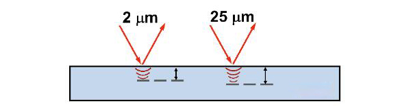 根據穿透深度Dp=λ/2πn1[sin2θ-(n2/n1)2]1/2可知,晶體折射率越大,穿透深度越淺。樣品折射率越高,穿透深度越深;入射角θ越大,穿透深度越淺;光的波長越短,穿透深度越淺。如下圖: