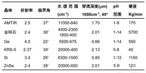 常見的有機化合物的折射率在1.5左右,需要ATR晶體的折射率大于1.5。常見的ATR晶體材料有金剛石(2.4)、ZnSe(2.4)、Ge(4.0)、Si(3.4)、KRS-5(2.37)、AMTIR(2.5)。