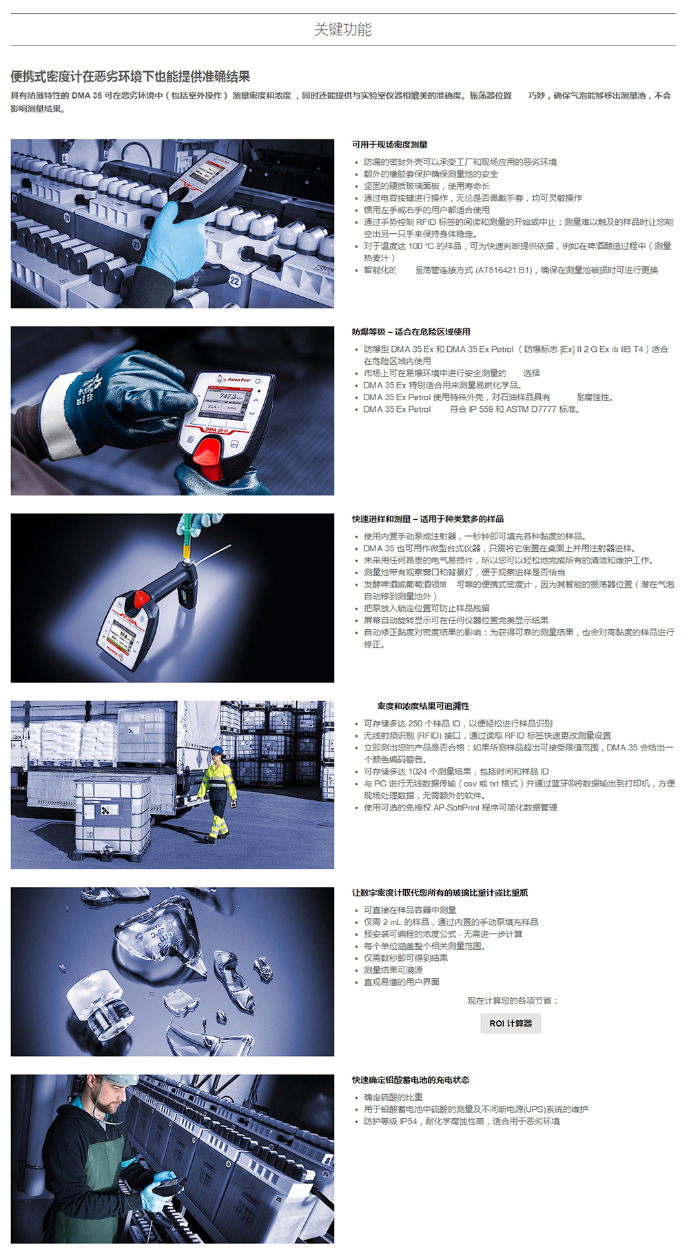 無論是攝入控制、在線質(zhì)量檢驗(yàn),還是在路上,可隨時(shí)隨身攜帶著 DMA 35 并在現(xiàn)場直接測量樣品的密度和濃度。只需一部便攜式密度計(jì)就可取代工作場所中的玻璃比重計(jì),同時(shí)還能提供與實(shí)驗(yàn)室儀器相媲美的準(zhǔn)確度。DMA 35 僅需使用兩毫升樣品,可以幫您節(jié)省大量的時(shí)間,因?yàn)槟鸁o需將樣品拿到實(shí)驗(yàn)室。它可承受室外使用時(shí)遇到的敲擊和飛濺。用于樣品快速識別的 RFID 接口和現(xiàn)場數(shù)據(jù)便捷處理的 藍(lán)牙 接口是此儀器的標(biāo)配部件。